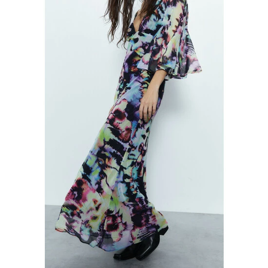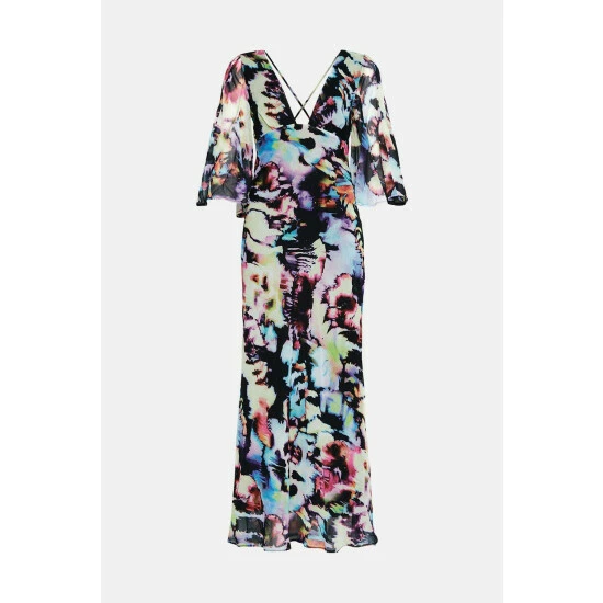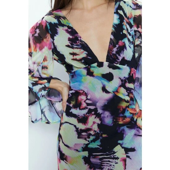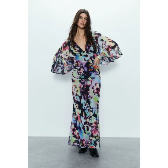 Abstract Print Fluted Sleeve Plunge Maxi Dress