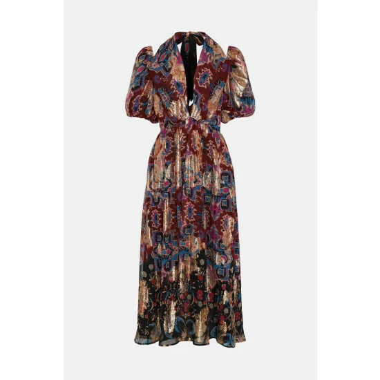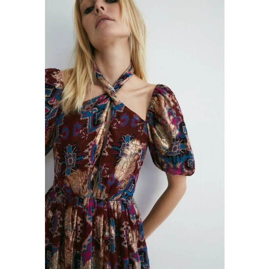 89% Viscose 6% Metallised fibre 5% Polyester. Model wears a UK size 10. Length from SNP: 130cm.