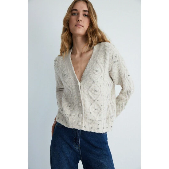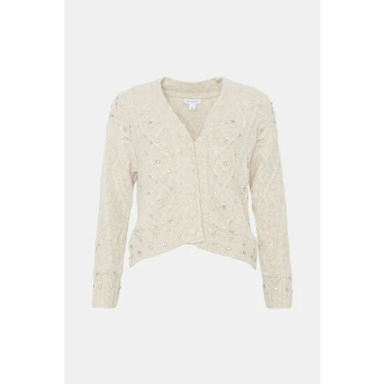 Luxe you knitwear with this diamante detailed cardigan. Embellished all over on a classic fit, V-neck cardigan, this is ideal for layering over going-out looks or elevating the everyday.