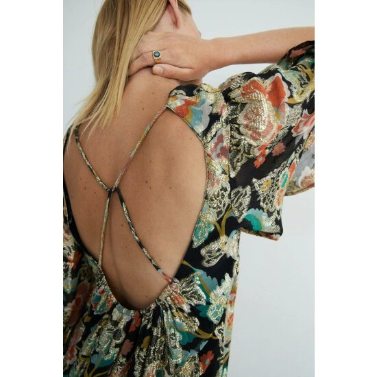 Main 79% Viscose and 21% Metallised Fibre. Lining 100% Polyester. Machine Wash. Model wears UK size 10. Length UK size 10: 132cm