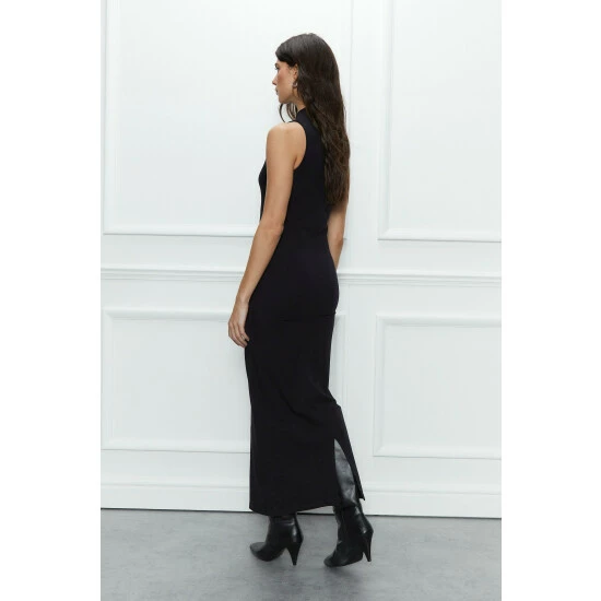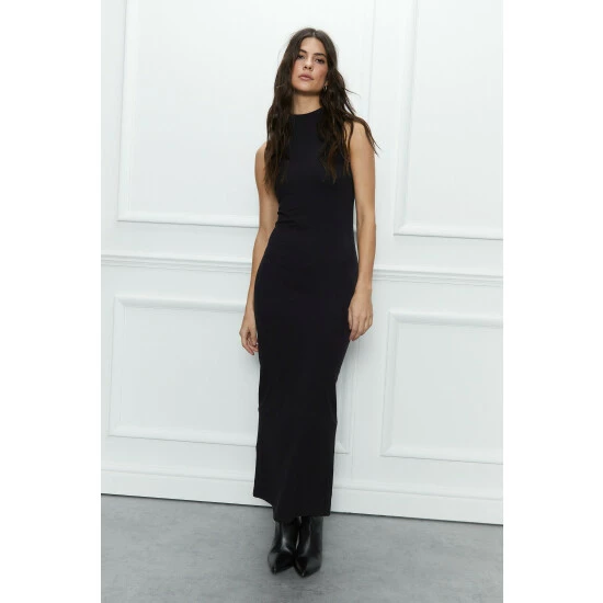 Style: Bodycon DressFabric: JerseyLength: MidiNeckline: Funnel NeckSleeve Length: Sleeveless