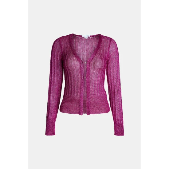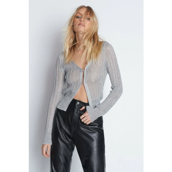 45% viscose 32% metallised fibre 23% polyester. Model wears UK size S. Length from side neck point is 58cm.