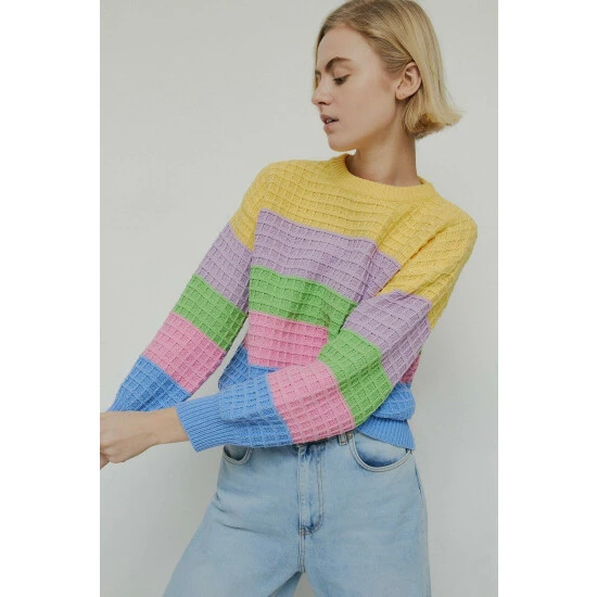 60% cotton 40% acrylic. Model wears UK S. Side neck point is 62cm.