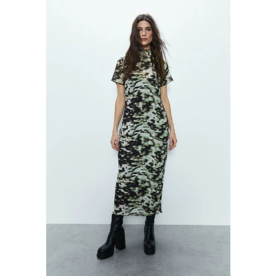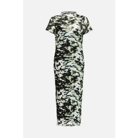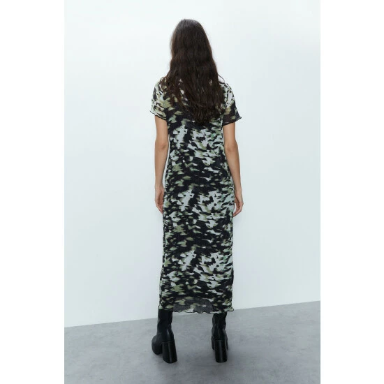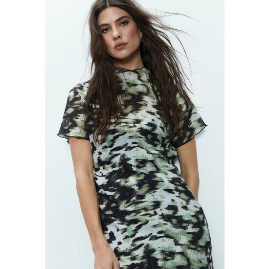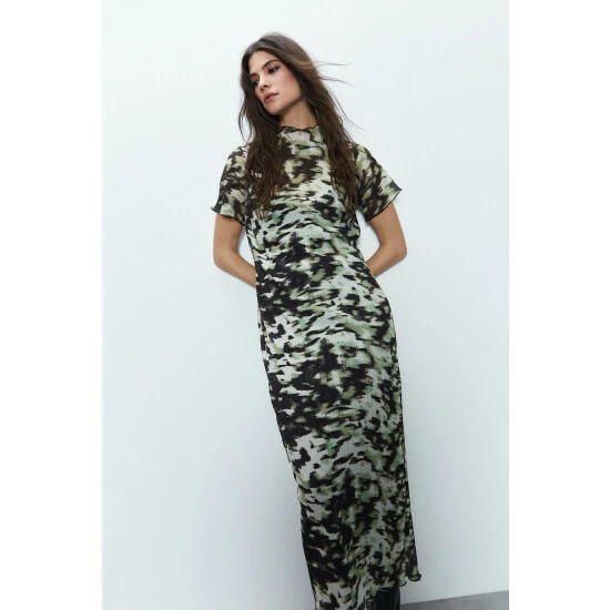 Style: Midi DressDesign: PrintFabric: PlisseLength: MidiNeckline: CrewSleeve Length: Short Sleeve