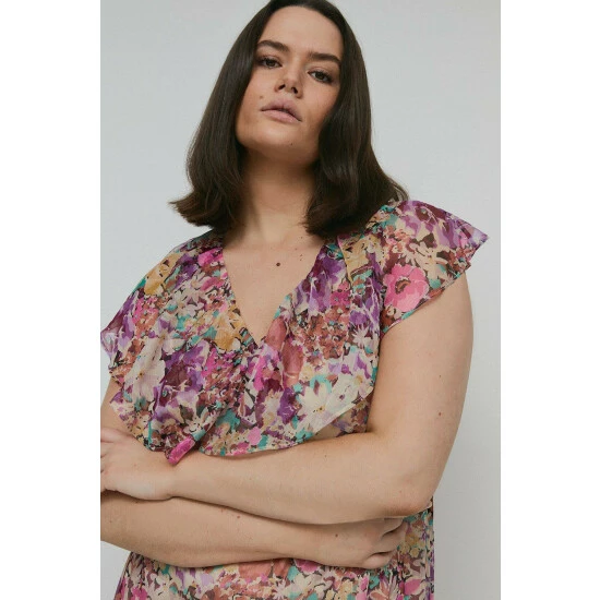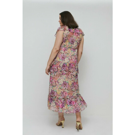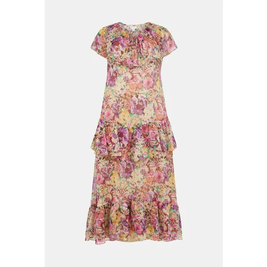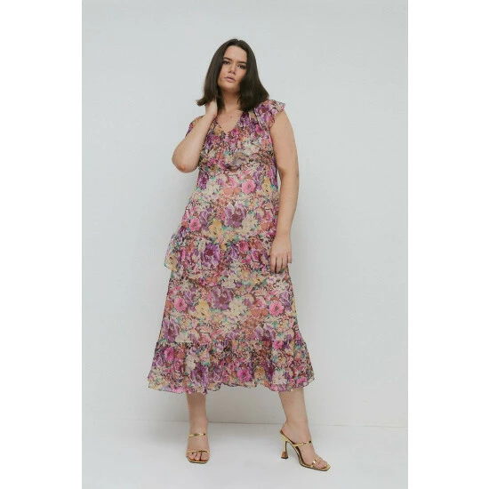 Part of the plus size collection. A lightweight floral-print midi dress with frilled tiers, V-neck and flared, cap sleeves.