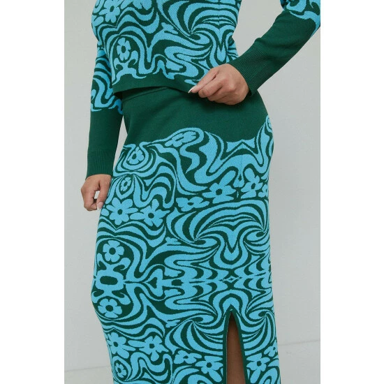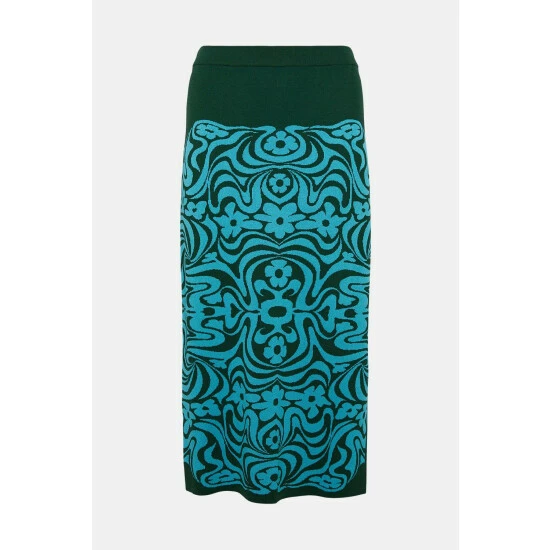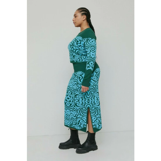 Part of the plus size collection. This floral jacquard knit midi skirt has a two-tone swirling print, colour-block waist panel and side hem split.