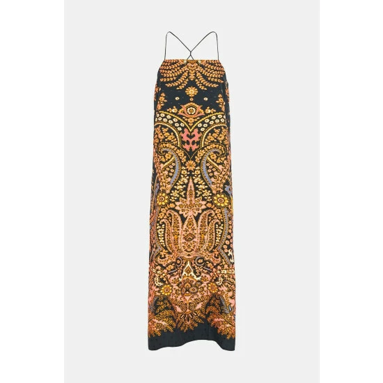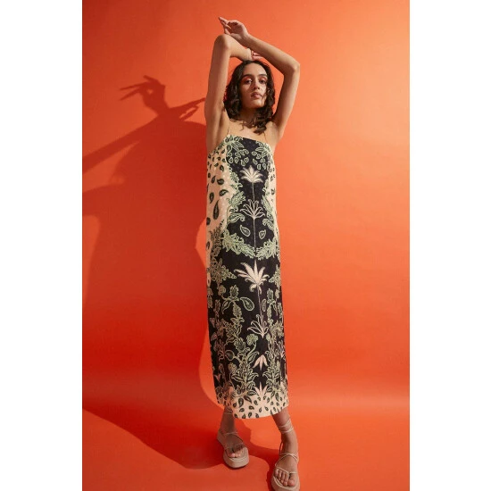 100% Viscose – Machine Wash. Model wears UK 10. Length in UK size 10: 132cm.