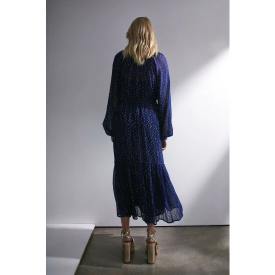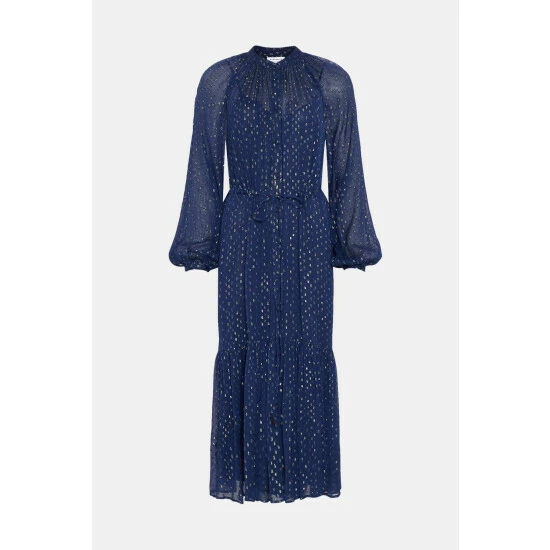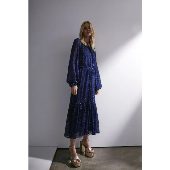 95% Viscose and 5% Metallised Fibre. Lining 100% Polyester. Machine Wash. Model wears UK size 10. Length UK size 10: 138cm