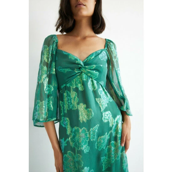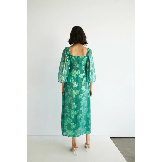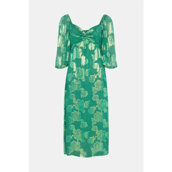 71% Viscose and 29% Metallised Fibre and Lining 100% Polyester. Machine Wash. Model wears UK size 10. Length UK size 10: 128cm