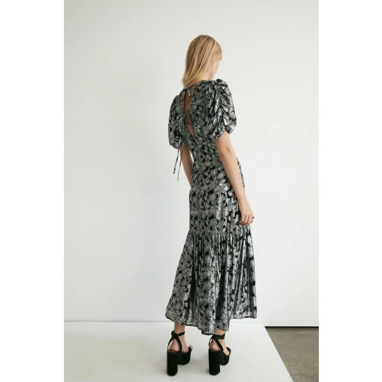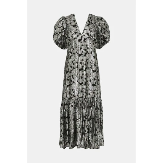 Main 74% Viscose and 26% Metallised Fibre and Lining 100% Polyester. Machine Wash. Model wears UK size 10. Length UK size 10: 128cm