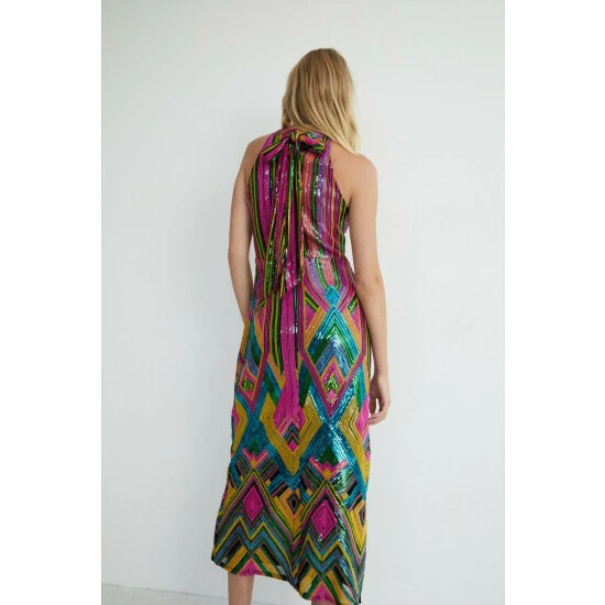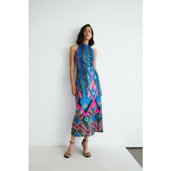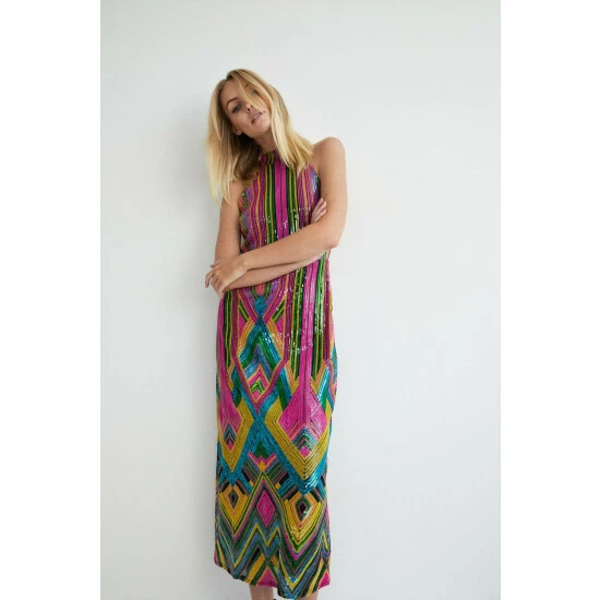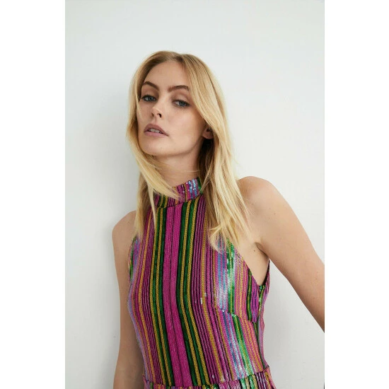 95% Polyester, 5% Elastane. Professional dry clean only. Model wears a UK size S. Length from SNP:130cm