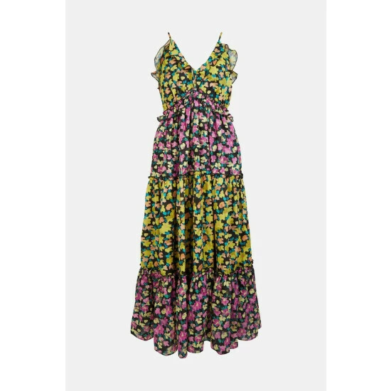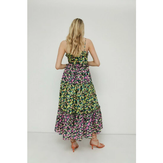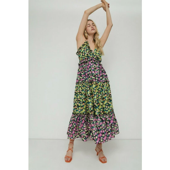 A maxi dress designed in a strappy style with a tiered skirt, contrasting floral print and ruffle detailing.
