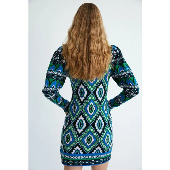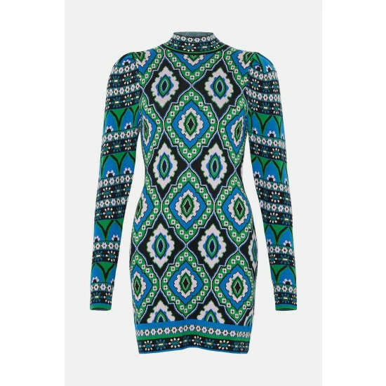 Crafted in an all over border print design, this form fitting, knitted mini dress comes complete with long sleeves and a funnel neck.