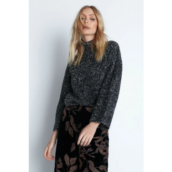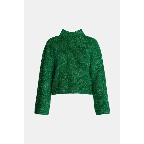 50% acrylic 50% polyester. Model wears UK size S. Length from side neck point is 54cm.