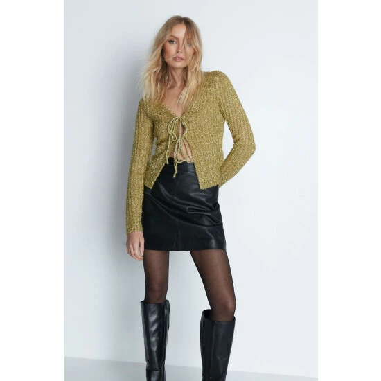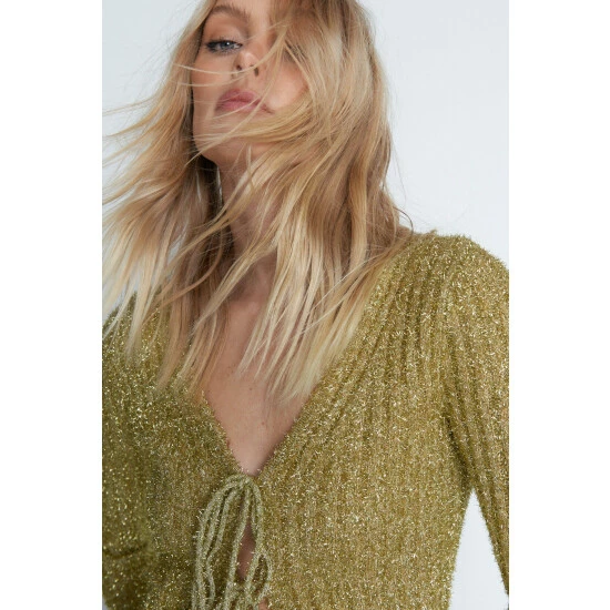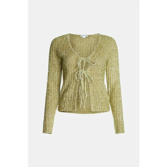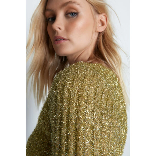 50% acrylic 50% polyester. Model wears UK size S. Length from side neck point is 58cm.
