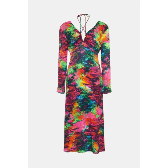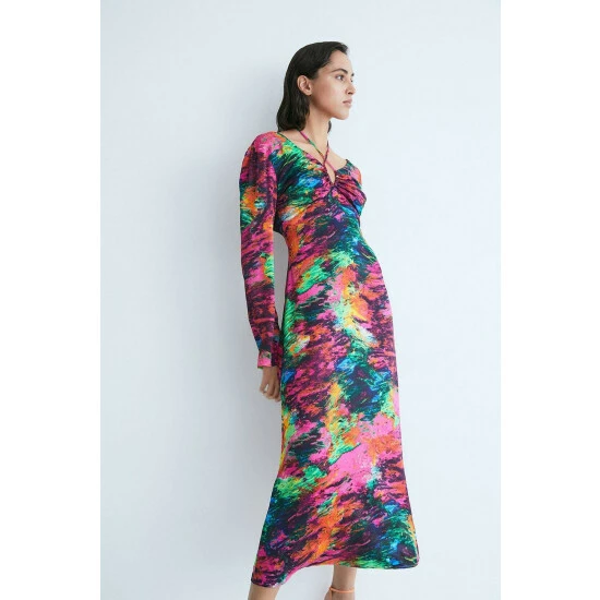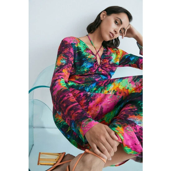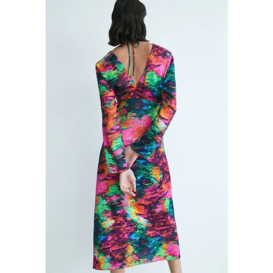 Main 100% Viscose. Lining 100% Polyester – Machine Wash. Model wears UK 10. Length in UK size 10: 132cm.