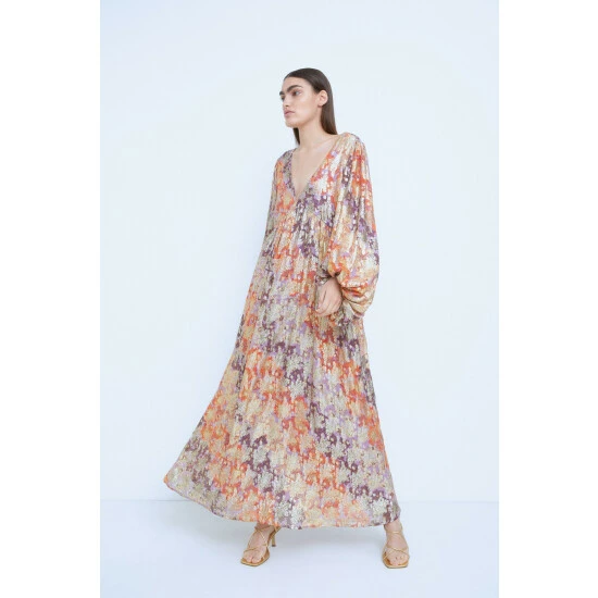 Main: 80% Viscose 20% Metallised fibre. Lining: 100% Polyester – Wash with similar colours. Model wears a UK size 10. Length from SNP: 145cm.