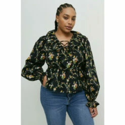 Warehouse Plus Size Floral Ruffle Detail Lace Up Blouse For Female