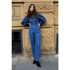 Warehouse Denim Puff Sleeve Pocket Front Jumpsuit For Female