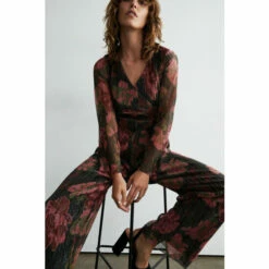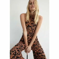 Warehouse Floral Print Velvet Halter Neck Wide Leg Jumpsuit For Female