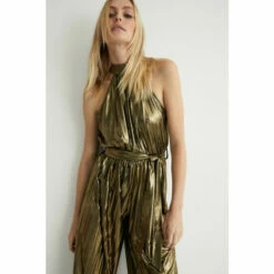 Warehouse Metallic Lame Pleated Halter Neck Jumpsuit For Female